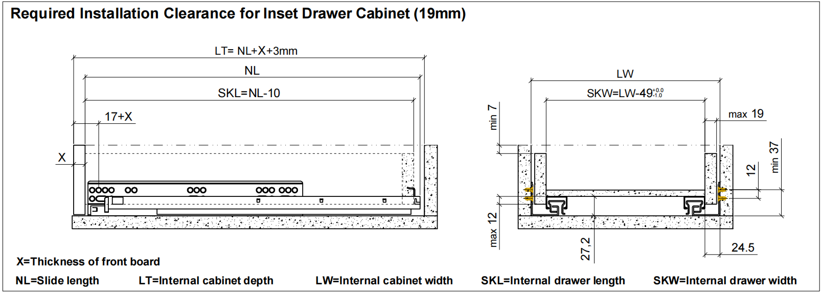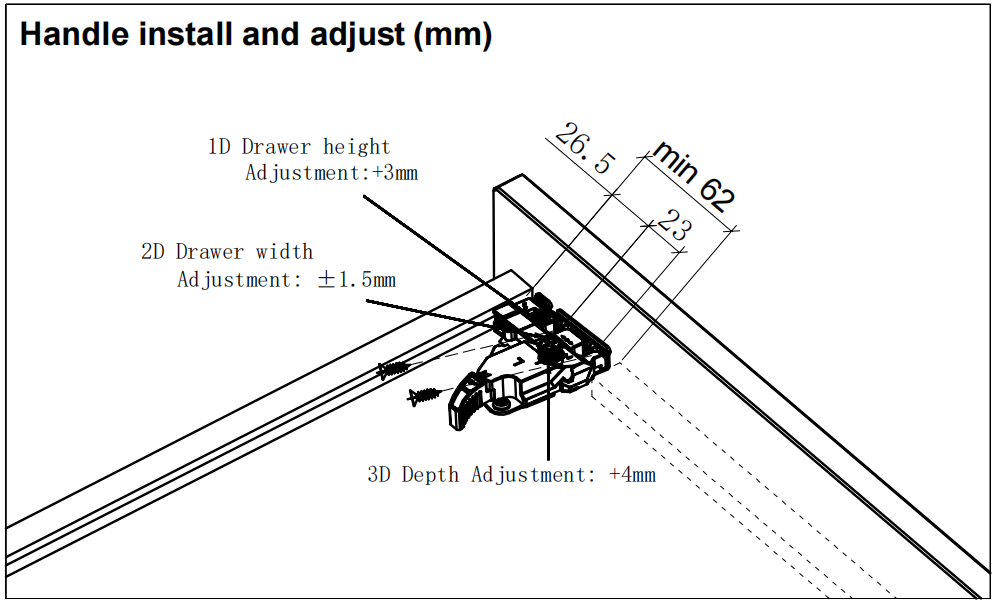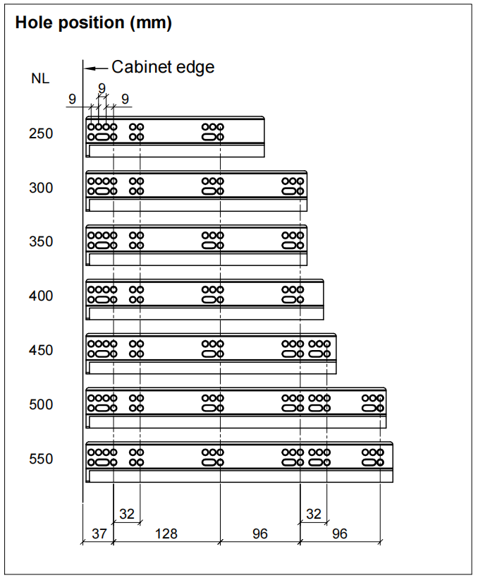 Полное расширение Более 50 000 испытаний на открытие и закрытие с нагрузкой 40 кг. Регулировка высоты ящика: 0~+3 мм. Регулировка ширины выдвижного ящика: ±1,5 мм. Упаковка: 10 комплектов/коробка.