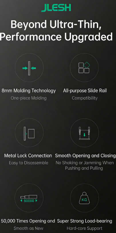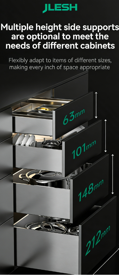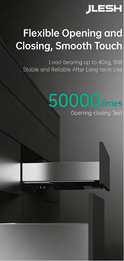 Полное выдвижение направляющих с доводчиком (совместимо со всеми типами направляющих, например, с механизмом открывания нажатием / механизмом открывания нажатием с доводчиком / механизмом открывания нажатием с ручкой).